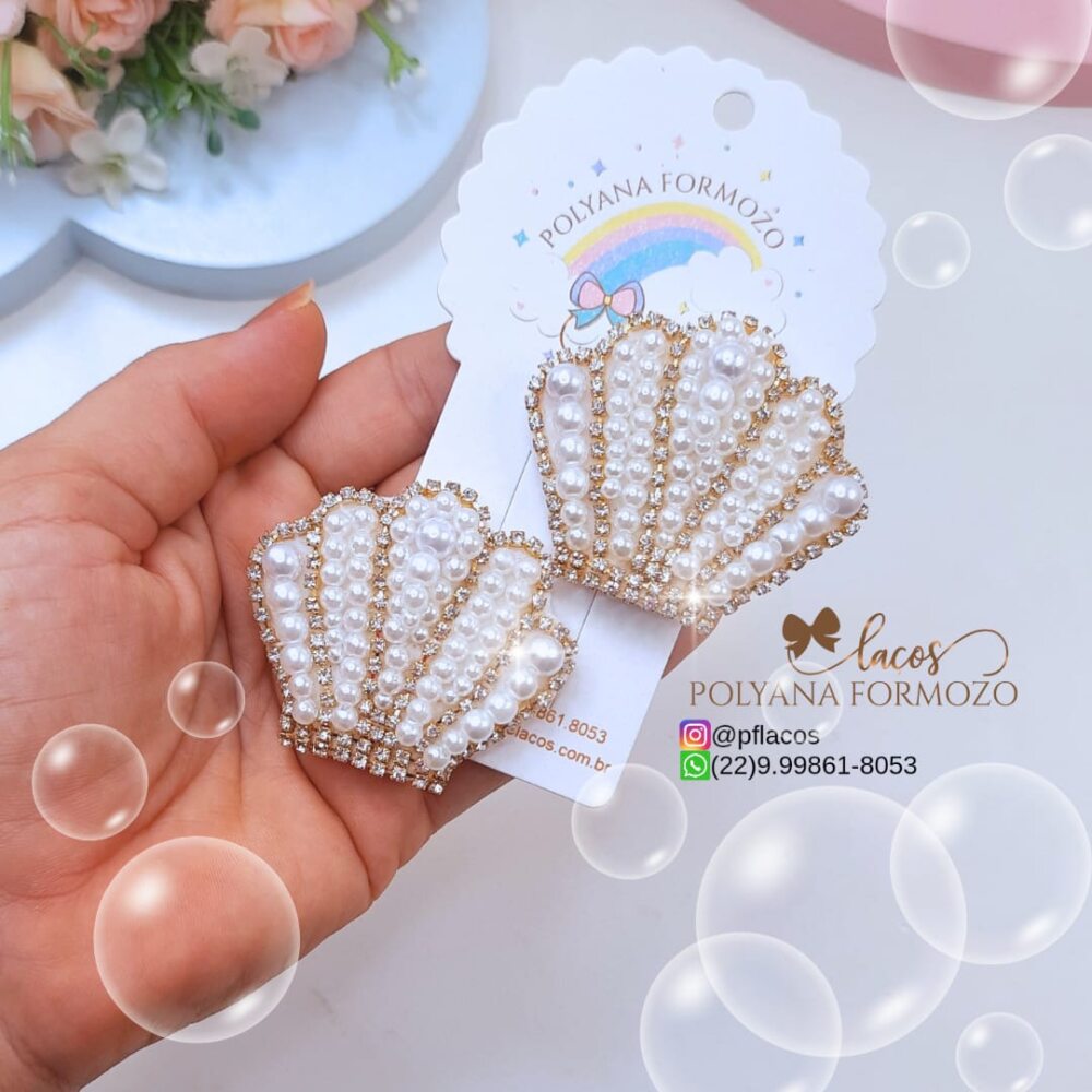 Parzinho de Concha Bordada à mão com pérolas e strás dourado.